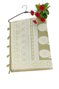 Drape yourself in elegance with this light olive green saree adorned with intricate white thread embroidery. The pallu features stunning paisley and geometric motifs, while the body is enhanced with delicate floral butis. Finished with a beautifully embroidered border and playful tassels, this saree is a perfect blend of traditional charm and contemporary grace.