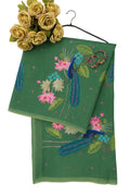 Bring grace to your wardrobe with this stunning green saree featuring elegant peacock and floral embroidery. Crafted from a lightweight fabric, it drapes beautifully and ensures comfort. The vibrant design makes it perfect for festive occasions, weddings, and parties.