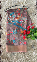 Celebrate artistry with this brown saree featuring a majestic peacock motif on the pallu. Enhanced with vibrant multicolored floral designs in shades of blue, red, and orange, this saree is a true masterpiece. Its subtle sheen and lightweight drape make it an ideal choice for festive occasions, cultural events, and statement ethnic wear.