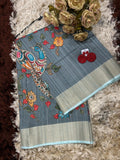 Add elegance to your wardrobe with this beautiful grey silk blend saree featuring a stunning hand-painted peacock and floral design. The subtle golden border with sky-blue edging enhances its charm, while the lightweight fabric ensures comfort all day. Perfect for weddings, festive occasions, and cultural events.