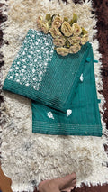 Step into timeless elegance with this deep teal green saree, featuring exquisite white floral embroidery and delicate kantha-style stitch detailing. Accented with playful tassels and a graceful sheen, this saree strikes the perfect balance between traditional artistry and modern sophistication—ideal for festive occasions and semi-formal gatherings.
