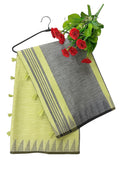 "Elegant handloom-style cotton saree in lime green and grey with tassel details, featuring woven stripes and geometric border design – perfect for casual and office wear."